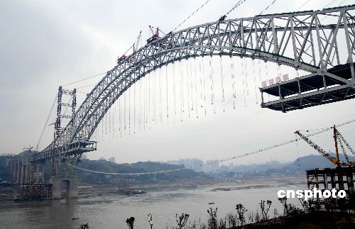 1月25日,“世界第一拱橋”的重慶朝天門長江大橋主拱合龍。大橋主跨將在今年6月合龍,并于年底竣工通車。重慶朝天門長江大橋2004年底動工,由主橋和東西引橋三部分組成,為中承式鋼桁系桿拱橋,雙層設(shè)計,上層為雙向6車道,下層為雙向輕軌和雙向4條預(yù)留車道。大橋兩座主墩主跨長達(dá)552米,比世界著名拱橋澳大利亞悉尼大橋的主跨還要長,成為“世界第一拱橋”。中新社發(fā) 郭晉嘉 攝