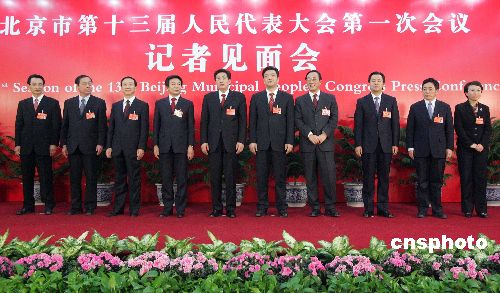 1月26日,北京市第十三屆人大一次會(huì)議閉幕,新當(dāng)選的北京市市長(zhǎng)郭金龍率全體副市長(zhǎng)集體亮相。從左至右分別為:陳剛、趙鳳桐、牛有成、蔡赴朝、郭金龍、吉林、劉敬民、陸昊、丁向陽(yáng)、程紅。中新社發(fā) 張宇 攝