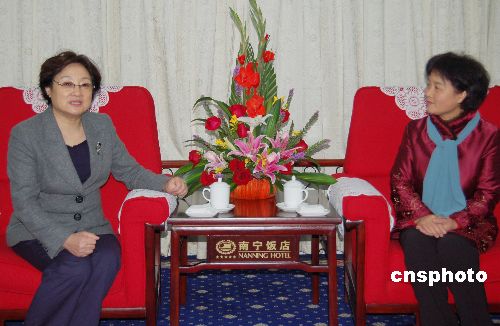 2月2日晚,在僑鄉(xiāng)廣西遭遇嚴重雨雪冰凍災(zāi)害急需援助之際,中國國務(wù)院僑辦主任李海峰女士(左)一行從北京飛赴南寧進行慰問,并與廣西自治區(qū)人大常委會副主任、廣西紅十字會會長劉新文進行會談,隨后李海峰代表國務(wù)院僑辦和海外僑胞向廣西災(zāi)區(qū)民眾捐助一百萬元人民幣。中新社發(fā) 劉萬強 攝