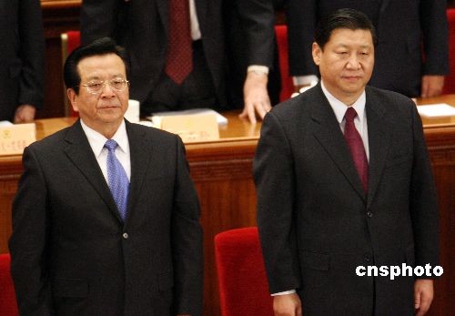 3月3日下午,全國政協(xié)十一屆一次會議在北京人民大會堂開幕,國家副主席曾慶紅(左)、中共中央政治局常委習(xí)近平出席。中新社發(fā) 任晨鳴 攝