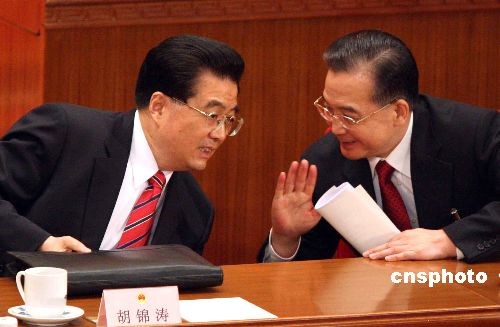 3月5日上午,十一屆全國人大一次會議在北京開幕。溫家寶作政府工作報告后,與胡錦濤進(jìn)行交談。中新社發(fā) 張宇 攝