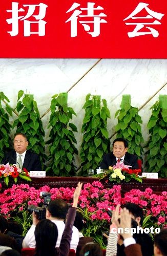 3月11日,十一屆全國人大一次會議新聞發(fā)布會在北京人民大會堂舉行。國家發(fā)展和改革委員會副主任解振華(左)、國家環(huán)境保護(hù)總局副局長張力軍,就環(huán)境資源、節(jié)能減排、2008奧運期間北京空氣質(zhì)量等問題回答記者提問。中新社發(fā) 王東明 攝