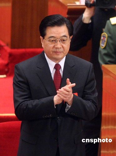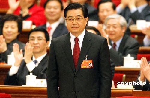 3月15日上午,十一屆全國人大一次會議第五次全體會議在北京人民大會堂舉行,胡錦濤再次當選中華人民共和國主席、中華人民共和國中央軍事委員會主席。中新社發(fā) 張宇 攝