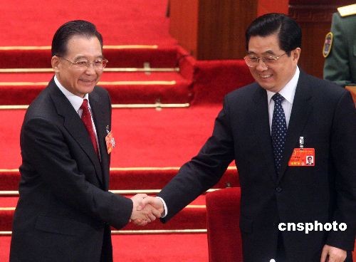 溫家寶再任國務(wù)院總理 胡錦濤主席握手致賀
