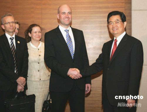 4月12日下午,海南省博鰲,中國國家主席胡錦濤會見來華訪問并出席博鰲亞洲論壇2008年年會開幕式的瑞典首相弗雷德里克·賴因費爾特以及隨行人員。中新社發(fā) 任晨鳴 攝