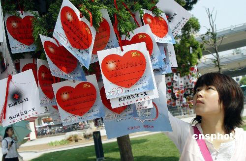 五月二十日,鄭州女孩在整理翻看松柏樹上懸掛的“愛心”牌。五月十九至二十一日是全國(guó)哀悼日,鄭州社會(huì)各界通過不同方式,悼念“五·一二”汶川大地震中失去生命的同胞,為幸存者祈福,街心公園許多樹梢掛滿“愛心”牌。
