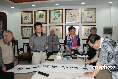 圖:世界華人美術(shù)家協(xié)會主席楊玉琪為賑災(zāi)揮毫