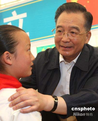 圖:溫家寶到綿陽帳篷學?赐麨膮^(qū)學生