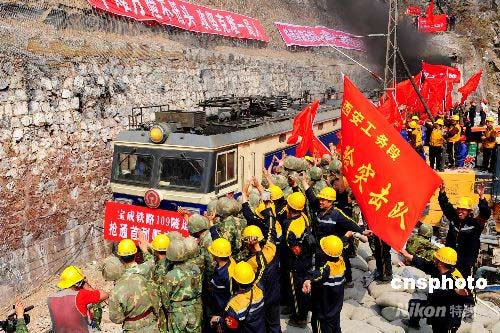 5月24日上午,首列滿載運往四川災區(qū)救災物資的搶977次列車,從寶成線徽縣至虞關站間109號隧道安全通過,這標志著因地震塌方在隧道內(nèi)脫線起火、中斷行車283小時的寶成鐵路全線,比預計時間提前7天恢復通車。 寶成鐵路是通往西南的鐵路大動脈,是四川抗震救災的生命線。5月12日14時28分,因四川汶川發(fā)生8級強烈地震引發(fā)山體崩塌,致使運行中的一列貨物列車在西安鐵路局管內(nèi)寶成線徽縣至虞關站間撞巨石脫線,12節(jié)裝有汽油的罐車被埋在109號隧道中起火燃燒,造成通往四川地震災區(qū)的大動脈寶成鐵路中斷行車。險情發(fā)生后,經(jīng)過鐵路職工、解放軍指戰(zhàn)員、武警官兵等2200多名搶險人員連續(xù)12個晝夜奮力搶修,終于將寶成鐵路109號隧道順利搶通。