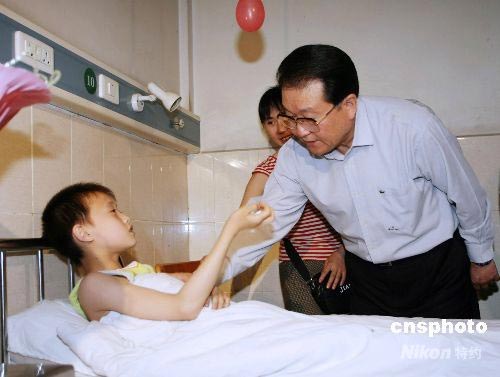 圖為李長春在醫(yī)院看望受傷兒童。
