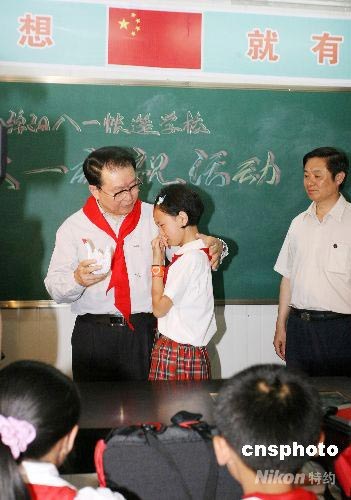 中共中央政治局常委李長春,6月1日赴四川災區(qū)看望慰問災區(qū)兒童,向災區(qū)轉(zhuǎn)移安置和受傷治療的學生轉(zhuǎn)交中央宣傳文化部門贈送的十萬臺收音機和一批少兒讀物及學習用品。中新社發(fā) 蒲滔 攝