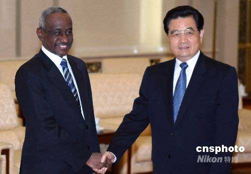 中國(guó)國(guó)家主席胡錦濤,6月11日在北京人民大會(huì)堂會(huì)見蘇丹共和國(guó)副總統(tǒng)阿里·奧斯曼·穆罕默德·塔哈。阿里·奧斯曼·穆罕默德·塔哈副總統(tǒng)是應(yīng)中國(guó)國(guó)家副主席習(xí)近平的邀請(qǐng),于6月9日至15日對(duì)中國(guó)進(jìn)行正式訪問。中新社發(fā) 任晨鳴 攝