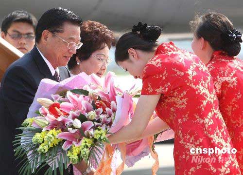 十一日下午三時十五分許,臺灣海峽交流基金會董事長江丙坤率海基會代表團抵達北京首都機場,禮儀小姐敬獻鮮花。中新社發(fā) 趙振清 攝