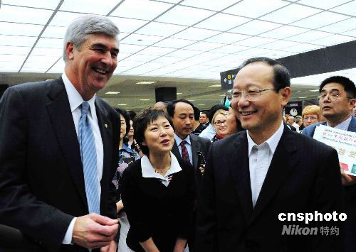當?shù)貢r間6月17日晚,中國公民赴美旅游首發(fā)團抵達華盛頓杜勒斯國際機場,中國國家旅游局局長邵琪偉在隨北京團抵達后對記者表示,中美兩國在旅游方面有了很好的旅游機制,首發(fā)團到達美國,標志著中美兩國團隊旅游開始全面啟動。這將對今后中美之間政治、經(jīng)濟、文化等方面的合作起到積極的推動作用。圖為邵琪偉受到美國商務部助理部長威廉姆斯·薩頓等熱烈歡迎。中新社發(fā) 邱江波 攝