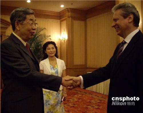 7月8日晚,當(dāng)羅馬尼亞駐華大使伊斯蒂奇瓦亞(右)用一口流利的中文與十屆全國人大常委會(huì)副委員長許嘉璐(左)進(jìn)行著一次關(guān)于全球化背景下語言作用的深刻對(duì)話時(shí),漢語無疑搭建了一座溝通中國與世界心靈與思想的橋梁。 包括伊斯蒂奇瓦亞及秘魯、保加利亞、孟加拉、印尼等國的駐華使節(jié),隨55個(gè)國家的100多名大學(xué)生漢語愛好者一道來到湖南長沙,這些學(xué)生將參加第七屆“漢語橋”世界大學(xué)生中文比賽。當(dāng)晚,許嘉璐在長沙會(huì)見了駐華使節(jié)一行。中新社發(fā) 傅煜 攝