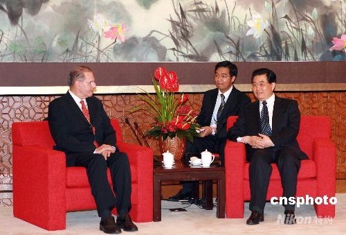 8月4日晚,中國國家主席胡錦濤在北京會見國際奧委會主席羅格等國際奧委會貴賓。中新社發(fā) 廖文靜 攝