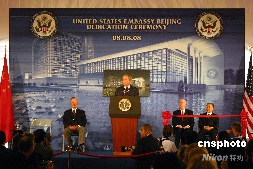 八月八日,美國(guó)駐華大使館舉行了隆重的新館開館儀式,前來(lái)出席北京奧運(yùn)會(huì)開幕式的美國(guó)總統(tǒng)布什、前總統(tǒng)老布什,以及中國(guó)國(guó)務(wù)委員戴秉國(guó)出席儀式并致辭。中新社發(fā) 阮煜琳 攝