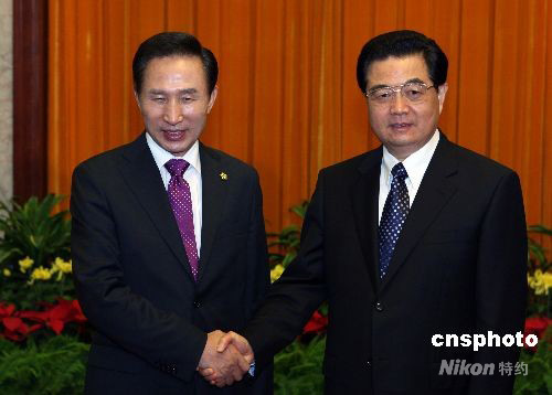 8月9日,中國國家主席胡錦濤在北京人民大會堂會見韓國總統(tǒng)李明博。中新社發(fā) 廖文靜 攝