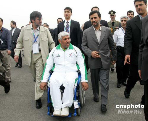 圖為伊朗將參加北京殘奧會的運動員Mirzaei Jaberi(左二)到機場迎接內(nèi)賈德總統(tǒng)。