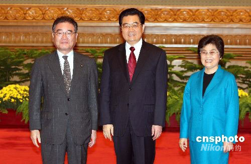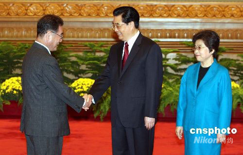 9月6日,國(guó)家主席胡錦濤夫婦在北京人民大會(huì)堂歡迎出席2008年殘奧會(huì)的各國(guó)貴賓。圖為胡錦濤夫婦歡迎日中友好協(xié)會(huì)會(huì)長(zhǎng)加藤弘一先生。中新社發(fā) 任海霞 攝