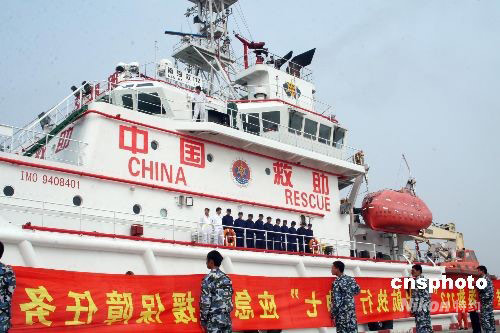9月21日下午,中國裝備最先進、救助功能最全的大馬力遠洋專用救助船“南海救一一二”輪一切準備就緒,從上海外高橋碼頭出征西太平洋海域,待命深海執(zhí)行神舟七號載人航天飛行任務(wù)海上應(yīng)急救援任務(wù)。中新社發(fā) 陸從兵 攝