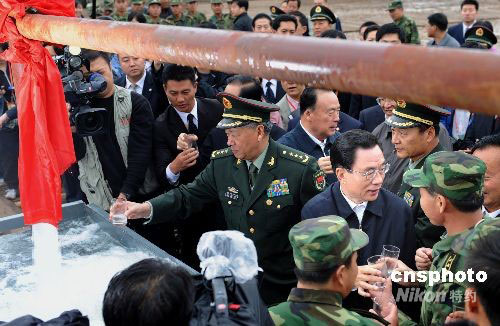 9月24日,寧夏回族自治區(qū)成立50周年慶;顒(dòng)中央代表團(tuán)團(tuán)長賀國強(qiáng)率一分團(tuán)到固原市慰問,在寧夏軍區(qū)給水團(tuán)正在打井的工地,賀國強(qiáng)拿起水杯同在場的民眾共同暢飲剛剛出井的“幸福水”。為幫助解決寧南山區(qū)和中部干旱帶用水困難,寧夏軍區(qū)組織給水團(tuán)實(shí)施新一輪“百井支農(nóng)富民”工程,初步解決近5萬人用水問題。中新社發(fā) 廖攀 攝