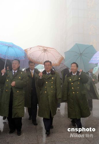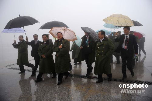 9月25日,寧夏六盤山寒雨紛飛,賀國強率團冒雨參觀位于六盤山主峰上的六盤山紅軍長征紀念館。當日,賀國強率中央代表團一分團繼續(xù)在寧夏固原市展開慰問。中新社發(fā) 廖攀 攝