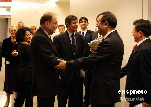 9月25日下午,中國(guó)外交部長(zhǎng)楊潔篪在紐約與歐盟理事會(huì)秘書(shū)長(zhǎng)兼歐盟共同對(duì)外關(guān)系與安全政策高級(jí)代表索拉納(左三)、歐盟委員會(huì)對(duì)外關(guān)系委員瓦爾德納(左一)、歐盟主席國(guó)法國(guó)外長(zhǎng)庫(kù)什內(nèi)(中)、候任主席國(guó)捷克外長(zhǎng)施瓦岑貝格(左二)等歐盟“三駕馬車(chē)”外長(zhǎng)舉行會(huì)晤。中新社發(fā) 李靜 攝