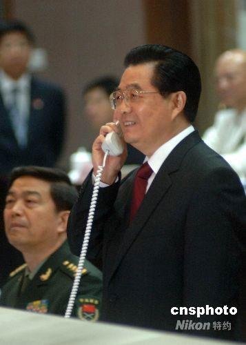 九月二十七日下午,神舟七號載人飛船翟志剛等三名航天員成功完成中國首次太空出艙活動后,親臨北京航天飛行控制中心觀看中國人這一歷史性壯舉的中共中央總書記、國家主席、中央軍委主席胡錦濤,與航天員們進行了天地通話。中新社發(fā) 張桐勝 攝