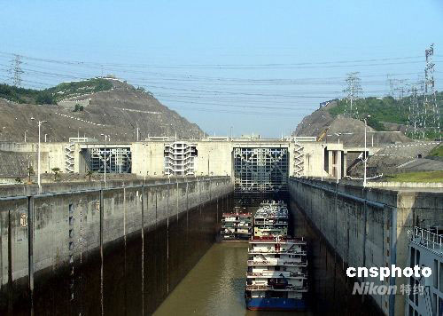 據(jù)長江三峽通航管理局消息,2008年10月3日下午,長江三峽雙線五級船閘由四級運行正式轉(zhuǎn)入五級運行。三峽工程自9月28日零時開始試驗性蓄水,水位從145米逐日抬升,截至10月4日15時已上升至154.25米。按照三峽船閘設(shè)計要求,三峽船閘在上游水位超過152.4米時,將由四級運行轉(zhuǎn)換為五級補水運行,同時,在152.4米到156米以下水位時仍可執(zhí)行四級運行方式。三峽雙線五級船閘自2003年6月16日試通航,5年多來一直采用四級運行的方式。中新社發(fā) 劉君鳳 攝