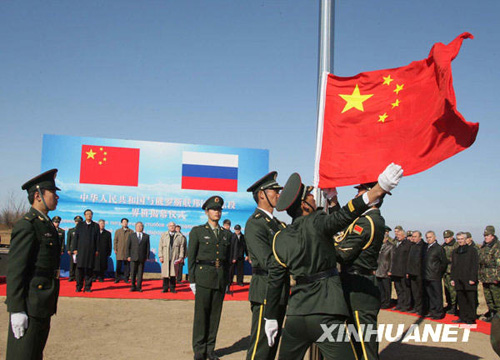 中俄界樁揭幕儀式上升起中華人民共和國國旗。新華社記者 汪永基 攝