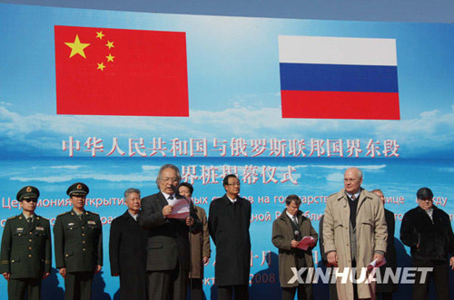 中國外交部大使趙希迪和俄羅斯外交部一亞局副局長(zhǎng)馬雷舍夫等在中俄界樁揭幕儀式上。 新華社記者 汪永基 攝