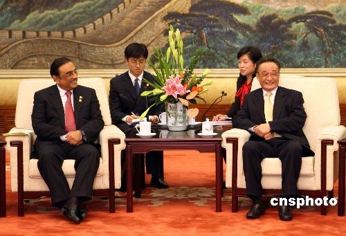 十月十六日,全國人大常委會委員長吳邦國在北京人民大會堂會見巴基斯坦總統(tǒng)扎爾達(dá)里一行。中新社發(fā) 任海霞 攝