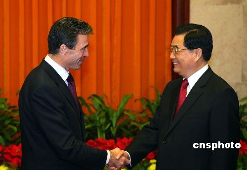 10月22日,中國國家主席胡錦濤在北京人民大會堂會見前來出席第七屆亞歐首腦會議的丹麥?zhǔn)紫嗬鼓律。中新社發(fā) 廖文靜 攝