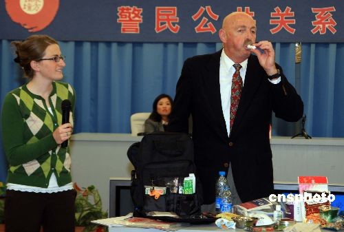 10月30日,來自美國猶他州公共安全部的資深培訓(xùn)官特德·沃雷,在上海向基層警察講解“警民公共關(guān)系”,并詳細(xì)介紹美國警察在社區(qū)微笑招呼、應(yīng)急防衛(wèi)等“秘笈”。中新社發(fā) 潘索菲 攝
