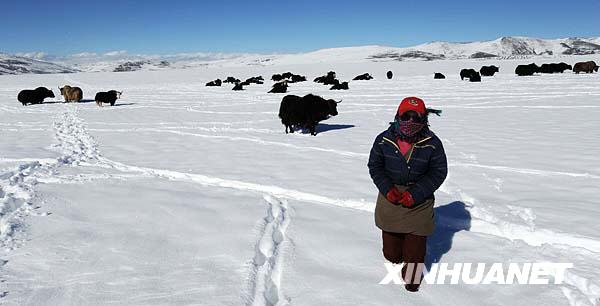 10月30日,西藏隆子縣日當(dāng)鎮(zhèn)牧民洛桑卓瑪在雪地里尋找失散的牦牛。 格桑達(dá)瓦 攝