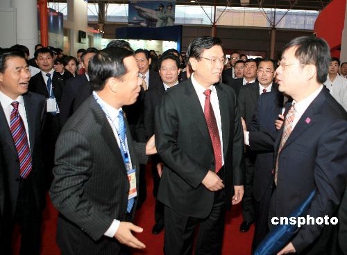 2008年11月4日第七屆中國航展在珠海盛大舉行,中共中央政治局委員、國務(wù)院副總理張德江,中共中央政治局委員、廣東省委書記汪洋在南航集團(tuán)總經(jīng)理、南航股份公司董事長劉紹勇的陪同下參觀了南航展臺(tái)。中新社發(fā) 羅廣泰 攝