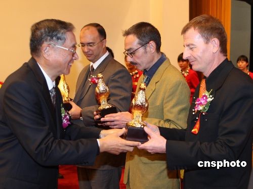 中國宋慶齡基金會(huì)主席胡啟立(左)將“國際和平友誼紀(jì)念牌”授予古巴等十一個(gè)國家的國際救援隊(duì),表彰他們?cè)谥袊y川地震救援中作出的貢獻(xiàn)。
