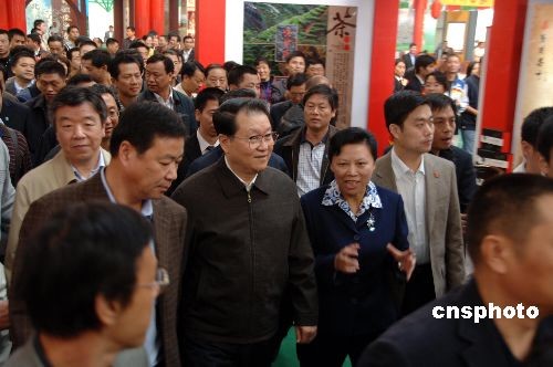 十一月十六日至二十日,中共中央政治局常委李長春在福建視察工作。十七日,李長春在中共福建省委書記盧展工、福建省省長黃小晶、中共南平市委書記雷春美(女)等陪同下,視察正在武夷山市舉行的第二屆海峽兩岸茶業(yè)博覽會(huì)展覽。中新社發(fā) 鄭祚聲 攝