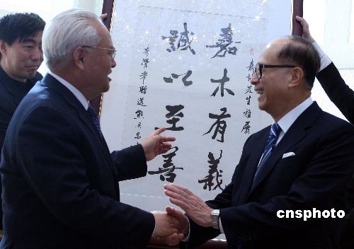 民政部長(zhǎng)李學(xué)舉(左)向李嘉誠(chéng)贈(zèng)送禮品。