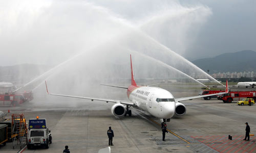2008年12月15日,深圳航空首航臺灣的第一班平日包機在臺北松山機場降落。松山機場方面以噴水方式表示歡迎。兩岸常態(tài)包機直航從此開始營運。(“中央社”圖)