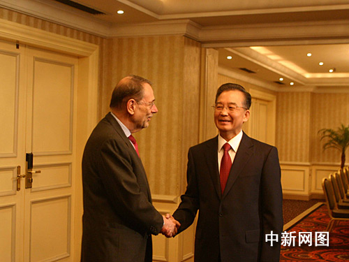 正在這里對歐盟總部進(jìn)行正式訪問的中國總理溫家寶,當(dāng)?shù)貢r間一月三十日上午在下榻飯店會見了歐盟理事會秘書長兼共同外交與安全政策高級代表索拉納(左)。雙方對中歐關(guān)系重要性均給予高度肯定。