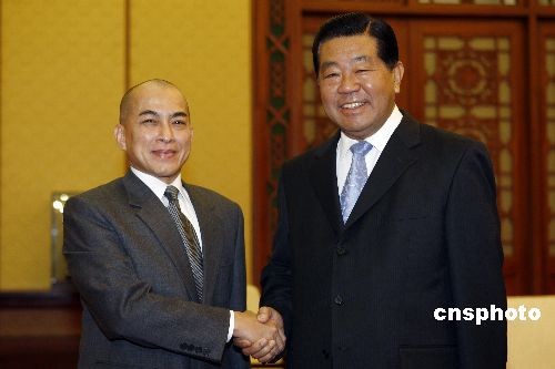 2月20日,全國政協(xié)主席賈慶林在北京人民大會(huì)堂會(huì)見了柬埔寨國王西哈莫尼。中新社發(fā) 盛佳鵬 攝