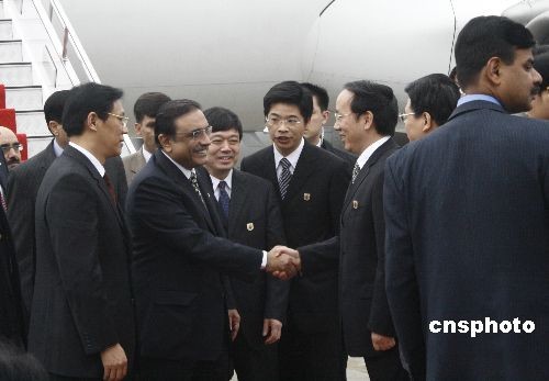 2月22日中午,在湖北進行友好訪問的巴基斯坦總統(tǒng)扎爾達里乘機抵達湖北宜昌市。在宜昌市期間,扎爾達里將與中國三峽總公司舉行項目會談,并參觀三峽工程紀念館和三峽大壩等。圖文扎爾達里總統(tǒng)與宜昌市長李樂成握手。中新社發(fā) 艾啟平 攝