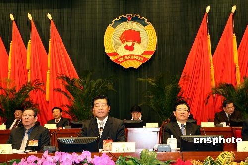 2月27日,政協(xié)第十一屆全國(guó)委員會(huì)常務(wù)委員會(huì)第四次會(huì)議在北京閉幕。中共中央政治局常委、全國(guó)政協(xié)主席賈慶林(中)出席會(huì)議并作講話。中新社發(fā) 杜洋 攝