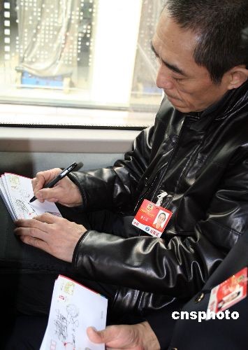 圖:張藝謀前往政協(xié)開幕大會路上忙簽名