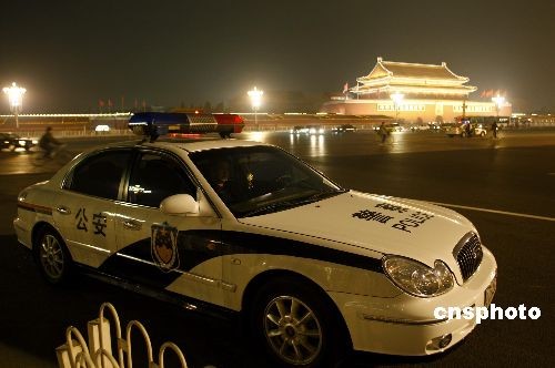 3月3日晚,北京警方在天安門廣場周邊加強(qiáng)夜間巡邏,確!皟蓵(huì)”安全。中新社發(fā) 鄭雄增 攝