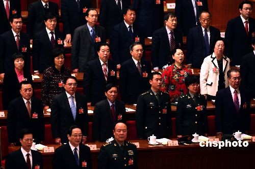 3月5日,第十一屆全國人民代表大會第二次會議在北京人民大會堂開幕。參會代表全體起立,高唱國歌。中新社發(fā) 杜洋 攝