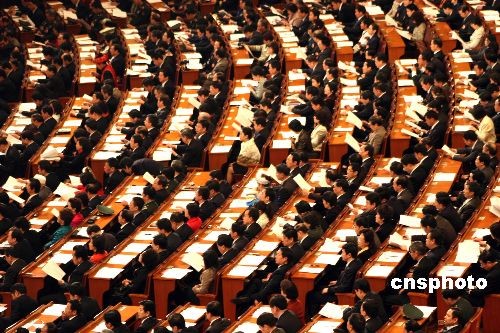 3月9日,十一屆全國人大二次會議在北京人民大會堂舉行第二次全體會議,全國人民代表大會常務(wù)委員會委員長吳邦國作全國人民代表大會常務(wù)委員會工作報告,代表們細(xì)聽“政府工作報告解讀”。中新社發(fā) 金立冬 攝