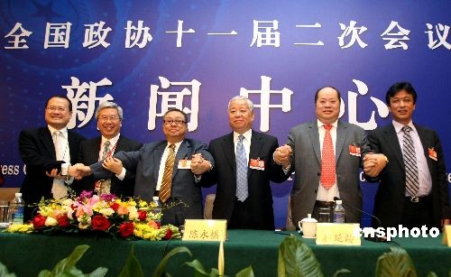 3月10日,全國政協(xié)十一屆二次會議舉行“港澳委員談如何應(yīng)對全球金融危機(jī)”專題記者會,陳永棋、李家祥、張華鋒、蔡冠深、許健康、顏延齡委員回答記者提問。記者會結(jié)束后,六位港澳委員手拉手,表示共同對抗金融危機(jī)。中新社發(fā) 傅丹丹 攝